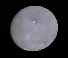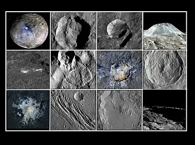 Mai multe forme de relief strălucitoare au fost descoperite pe planeta pitică Ceres de către sonda spațială Dawn în 2015.[14] Cea mai luminoasă pată este situată în mijlocul craterului Occator și este numit „pata luminoasă 5”. Există 130 de zone luminoase care au fost descoperite pe Ceres, despre care se crede că sunt argile bogate în sare sau amoniac.[15] Oamenii de știință au raportat că petele luminoase de pe Ceres pot fi legate de un tip de sare în 2015, în special o formă de saramură care conține sulfat de magneziu hexahidrat (MgSO4·6H2O); s-a găsit, de asemenea, că petele sunt asociate cu argile bogate în amoniac.[16]