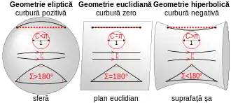 Geometria eliptică are proprietăți care diferă de cele ale geometriei plane euclidiene clasice. De exemplu, suma unghiurilor interioare ale oricărui triunghi este întotdeauna mai mare de 180°.
