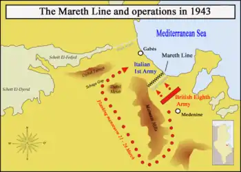 Linia Mareth.[13] În acest timp, el a raportat generalului britanic Sir Harold Alexander, comandantul grupului de armate 18, și a intrat în conflict cu vice-mareșalul aerului Sir Arthur Coningham despre lipsa sprijinului aerian adecvat trupelor sale. Când Coningham a trimis trei ofițeri la sediul lui Patton pentru a-1 convinge că britanicii oferă un amplu sprijin aerian, aceștia s-au trezit în mijlocul unui atac aerian german și o parte din tavanul biroului lui Patton s-a prăbușit în jurul lor. Vorbind mai târziu despre piloții germani care au lovit clădirea, Patton a remarcat: