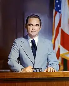 George Corley Wallace Jr. (n. , Clio(d), Alabama, SUA – d. , Montgomery, Alabama, SUA)[7] a fost un politician american. Acesta a ocupat funcția de guvernator al Alabamei timp de patru mandate și rămâne cunoscut datorită convingerilor sale despre segregația rasială(d).[8][9][10] În timpul mandatului său, Wallace a promovat „dezvoltarea industrială, scăderea impozitelor și educația vocațională”.[11] A candidat la alegerile prezidențiale din Statele Unite de trei ori în calitate de membru al Partidului Democrat și o dată ca membru al American Independent Party(d). S-a opus politicilor de desegregare(d) și a susținut legile Jim Crow în timpul mișcării pentru drepturile civile(d), declarând în discursul inaugural din 1963(d) că promovează „segregare astăzi, segregare mâine, segregare pentru totdeauna”.[12]