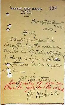 În seara zilei de 24 august gen. Sănătescu, în calitate de prim-ministru, i-a cerut gen. Mihail să evacueze trupele din capitală, retrăgându-le pe Argeș, în regiunea Buda.[12][15] A făcut acest lucru transmițându-i un bilet printr-un curier care s-a deplasat la adăpostul antiaerian al Palatului CFR, unde se afla gen. Mihail. Pentru a nu crea panică, Mihail nu a arătat nimănui biletul, care a fost găsit și confiscat mai târziu la percheziția efectuată cu prilejul arestării sale din ianuarie 1948.