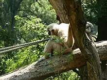 Gibonii se hrănesc cu muguri, frunze și fructe. Chiar și când stau nemișcați, atârnă în copaci folosind un braț sau ambele. Mănâncă, se odihnesc, se joacă, se îngrijesc și chiar se împerechează în timp ce stau atârnați.