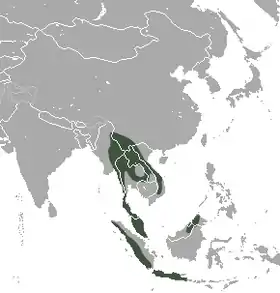 Este răspândit din sudul provinciei Yunnan (China), prin estul și sudul Birmaniei, ce mai mare parte a Laosului și Vietnamului, nordul Cambodgiei și cea mai mare parte a Tailandei, spre sud în Malaezia penininsulară, Tioman (Malaezia), Sumatra (în special în munți), Java și Borneo (Brunei, nordul provinciei Kalimantan, Sabah și nordul Sarawakului).