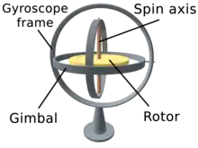 Un giroscop este alcătuit dintr-un rotor (de obicei de forma unui disc), fixat într-un cadru astfel încât să se poată roti în jurul oricăreia dintre cele trei axe (în cazul unui giroscop cu trei grade de libertate). Punctul de fixare este de în principiu centrul de masă și de simetrie, adică centrul discului.