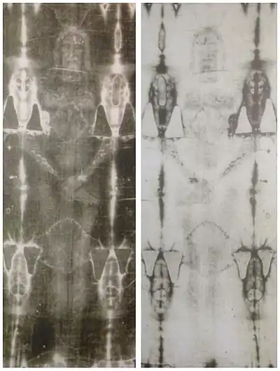 În 1898, cavalerul Secondo Pia a avut ideea de a fotografia „pânza sfântă” pentru publicitate în toata lumea, dar pe negativ în loc de fâșii obișnuite, i-a apărut imaginea unui om în suferință, după descrierea fotografului.[26][27] Isteria provocată de accesul la giulgiu a determinat municipalitatea din Torino să închidă lada cu relicva. Pentru prudență, giulgiul nu a mai fost expus.