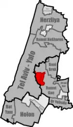 ![]() O panoramă a orașului la vest de Dealul Kozlovski. În spate se văd blocurile turn ale Tel Avivului | |||