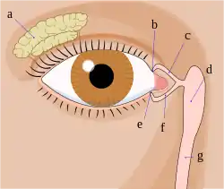 ![]() Aparatul lacrimal a. Glanda lacrimală b. Punctul lacrimal superior c. Canalul lacrimal superior d. Sacul lacrimal e. Punctul lacrimal inferior f. Canalul lacrimal inferior g. Canalul lacrimonazal | |