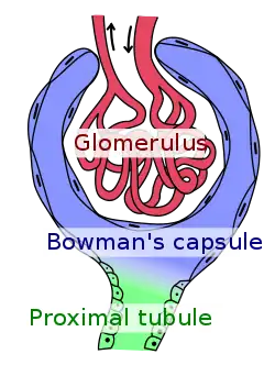 ![]() Glomerulus (roșu), capsula lui Bowman (albastru) și tubul proximal (verde). | |