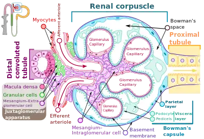 Glomerulus este un smoc de capilare situate în interiorul capsulei lui Bowman în rinichi. [2] Celulele mesangiale glomerulare susțin structural smocurile. Sângele intră în capilarele glomerulului printr-un singur arteriole numit arteriole aferente și iese printr-un artericol eferent.[3] Capilarele constau dintr-un tub căptușit de celule endoteliele cu un lumen central. Decalajele dintre aceste celule endoteliale se numesc fenestrae. Pereții au o structură unică: există porii dintre celulele care permit apei și substanțelor solubile să iasă, iar după ce trec prin membrana subsolului glomerular, iar între podocite procesele de picior, introduceți capsula ca ultrafiltrat.