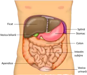 - abdomen - parte a corpului situată între torace și bazin, în care se găsesc: stomacul, ficatul, pancreasul, splina, intestinele; denumiri populare: burtă, pântece.