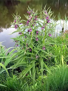 - plantă erbacee toxică, cu tulpina ramificată, acoperită cu peri aspri, cu flori roșii-violacee, mai rar albe, dispuse în raceme (Symphytum officinale); altă denumire: iarba lui Tatin. - târtan - vezi Crambe tataria.