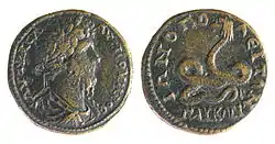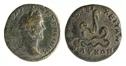 - moneda bătută de împăratul Decimus Clodius Albinus (196-197) în cetatea Pautalia (astăzi orașul bulgar Kiustendil) din provincia romană Tracia. Pe aversul monedei este reprezentat chipul împăratului, iar pe revers este reprezentat un șarpe încolăcit încercând să înghită o coloană, aflată în dreapta. Potrivit unor cercetători, șarpele este Glykon.