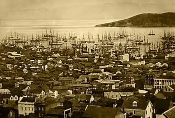 Pentru a satisface nevoile noilor sosiți, vase cu bunuri din toată lumea — porțelan și mătase din China, bere din Scoția — au fost aduse la San Francisco.[30] La sosirea în San Francisco, căpitanilor vaselor le-au dezertat echipajele și au plecat în căutare de aur. Sute de vase au fost abandonate, iar portul San Francisco a devenit o pădure de catarge. Localnicii întreprinzători au preluat aceste nave abandonate și le-au transformat în depozite, magazine, cârciumi, hoteluri, și pe unul în închisoare.[31] Multe dintre ele au fost distruse și folosite pentru întărirea solului pentru a crea mai mult spațiu construibil în orașul care se extindea cu repeziciune.
