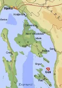 Insula este situată în nordul Mării Adriatice, chiar în largul coastei cantonului Primorje-Gorski Kotar, Croația, cu o suprafață de aproximativ 4,5 kilometri pătrați (1,7 mi2). Expusă vânturilor puternice bora, în special iarna, suprafața insulei este aproape complet lipsită de vegetație, de unde și numele de Goli Otok (literal, „insula sterilă/stearpă” în limba croată). Este cunoscută și sub numele de „Alcatrazul croat” datorită închisorii de pe insulă și a securității ridicate.[4]
