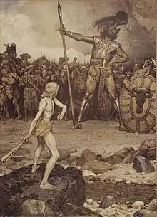 În capitolul 1 Samuel, 17 [1] din Biblie este descrisă lupta dintre Goliat și David din timpul războiului evreilor cu filistenii.
