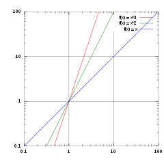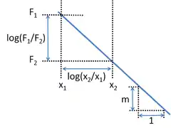 Cu alte cuvinte, F este proporțional cu x la puterea pantei dreptei din graficul său logaritmic. Mai exact, o dreaptă dintr-un grafic logaritmic care conține punctele (F0, x0) și (F1, x1) va corespunde funcției: