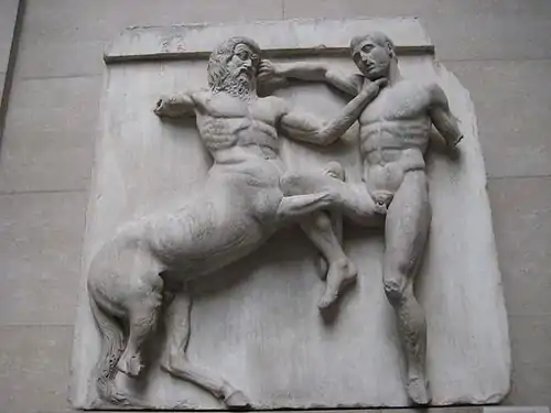 Metopele templului lui Zeus din Olimpia înfățișează muncile lui Hercule, remarcându-se prin soliditatea aproape arhotecturala a figurilor, chiar și statice, că cele trei verticale , a Atenei, a lui Atlas și a lui Heracle sau atunci când se lupta cu taurul din Cretă, unde liniile oblige sugerează o întreagă geometrie de forțe care se echilibrează, lupta crâncenă dintre Centauri și Lapiți, în contrast cu severitatea lui Apolo care domină scenă.