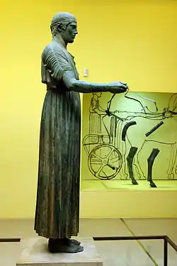 Conducătorul de car de la Delfi era rodul unei arte conștiente. Partea de jos a corpului este alungită din grijă pentru corecția optică și mizează în permanentă efectele de contrast: grelele pliuri verticale ale chitonului, asemenea unei coloane ornate cu caneluri, pun în evidență pliurile fine de pe umeri, iar rotunjirea treptată fără aplatizări a chipului pune în valoare relieful accentuat al buzelor, în timp ce grafismul șuvițelor cizelate, lipite de cap, contrastează deopotrivă cu formă reliefată a chipului și cu tratarea plastică a buclelor laterale.