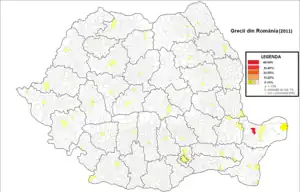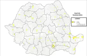 Cei mai mulți greci din România trăiesc în județul Constanța, județul Brăila și județul Tulcea. Comuna Izvoarele (în greacă Ιζβοάρελε) și orașul Sulina (în greacă Σουλινάς) din județul Tulcea au cele mai mari ponderi de locuitori greci din întreaga țară (43,82% din populația comunei Izvoarele).
