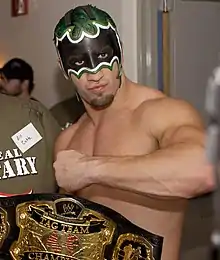 Helms (as The Hurricane) with the World Tag Team Championship.