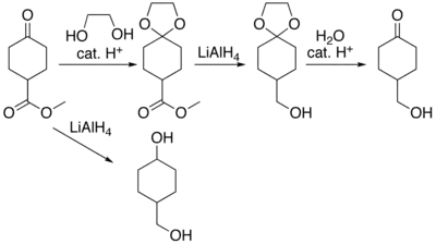 Protejarea unui alcool prin formarea unui tetrahidropiranileter, urmată de deprotonare. Ambele etape necesită catalizatori acizi.
