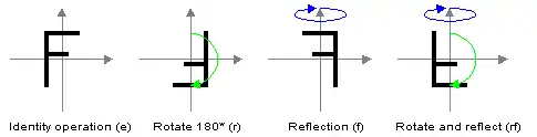 Identic (e), rotit cu 180° (r), reflectat (f), rotit și reflectat (rf)