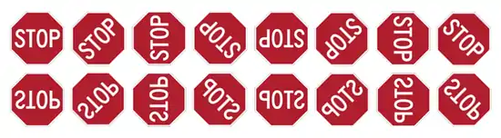 Primul rând arată efectul celor opt rotații, iar al doilea rând arată efectul celor opt reflexii, acționând în fiecare caz asupra indicatorului de oprire cu orientarea așa cum se arată în stânga sus.