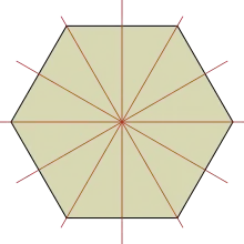 Un poligon regulat cu laturi are simetrii diferite: simetrii de rotație și simetrii de reflexie. De obicei, aici se consideră . Rotațiile și reflexiile asociate formează grupul diedral . Dacă este impar, fiecare axă de simetrie conectează punctul de mijloc al unei laturi de vârful opus. Dacă este par, există axe de simetrie care leagă punctele de mijoc ale laturilor opuse și axe de simetrie care leagă vârfuri opuse. În ambele cazuri, există axe de simetrie și elemente în grupul de simetrie.[4] Reflexia față de o axă de simetrie urmată de reflexia față de o altă axă de simetrie produce o rotație de două ori mai mare decât unghiul dintre aceste axe.[5]