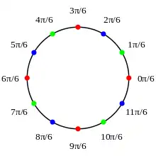 Rădăcinile de ordin 12 al unității, care sunt puncte pe cercul unitate complex, formează un grup abelian multiplicativ G, prezentat în imaginea din dreapta, ca bile colorate, cu numărul din fiecare punct reprezentând argumentul său complex. Considerând subgrupul N format din rădăcinile de ordin patru ale unității, prezentate ca bile roșii, acest subgrup împarte grupul în trei comulțimi, prezentate cu roșu, verde și albastru. Se poate verifica dacă comulțimile formează un grup de trei elemente (produsul unui element roșu cu un element albastru este albastru, inversul unui element albastru este verde etc.). Astfel, grupul factor G / N este grupul celor trei culori, care se dovedește a fi grupul ciclic cu trei elemente.