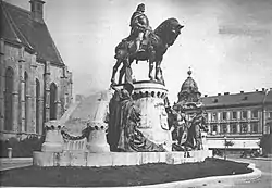 Pe soclu s-a aflat inițial inscripția maghiară Mátyás Király (Regele Matia, între 1902-1918), înlocuită apoi cu Matei Corvinul (1918-1940), Mátyás Király (1940-1944), Mathias Rex (după 1944 până în prezent).