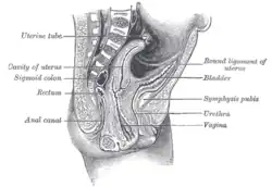 ![]() Secțiune sagitală prin pelvisul unei femei nou-născute (formațiunea gubernaculumului este reprezentată de ligamentul rotund al uterului, vizualizat în partea dreaptă sus) | |