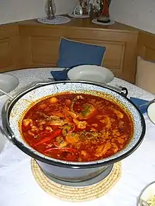 Halászlé este o supă tradițională savurată atât de localnici, cât și renumită de turiști. Un ingredient important este un fel de bulion[2] format din garnituri de pește, cum ar fi capete proaspete de crap, oase, piele și aripioare cu legume care pot include ceapă roșie, ardei verzi și roșii. Înainte de a fi servit, se adaugă boia pe supa clocotită.