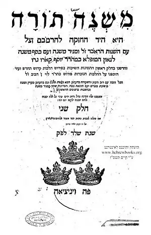 Pagina de titlu pentru Mişne Tora de Moshe ben Maimon haRambam, tipărită în Veneţia în 1575
