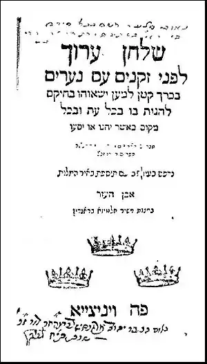 Pagina de titlu pentru Şulhan Aruh de Iosef Karo, tipărită în Veneţia în 1574