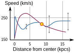 Curba de rotație a Căii Lactee. Axa verticală (ordonata) reprezintă viteza de revoluție în jurul centrului galactic. Axa orizontală (abscisa) reprezintă distanța la centrul galactic. Soarele corespunde punctului galben. Curba observată este albastră; cea prezisă pornind de la masa stelară a gazului din Calea Lactee este în roșu. Dispersia observațiilor este indicată de barele gri. Diferența dintre cele două curbe este cauzată de materia întunecată sau prin faptul că legile gravitației sunt diferite de cele cunoscute.[1][2][3]