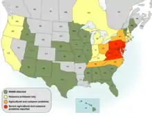 Până în 2009, acest dăunător a ajuns în Maryland, Virginia de Vest, Virginia, Tennessee, Carolina de Nord, Kentucky, Ohio, Illinois și Oregon[15]. În 2010, acest parazit a fost găsit în alte state, inclusiv Indiana[16], Michigan[17], Minnesota[18] și alte state[19].