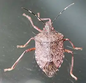 Adulții sunt de aproximativ 1,7 cm lungime și aproximativ la fel ca lățime, având forma de scut heraldic caracteristică insectelor din superfamilia Pentatomoidea. Acestea sunt, în general, maro închis atunci când sunt privite de sus și de un alb-crem-maro dedesubt. Colorația individuală poate varia, cu unele insecte având diferite nuanțe de roșu, gri, maro, cupru sau negru. Antenele sunt dungate cu benzi colorate deschis, iar marginea abdomenului au benzi închise la culoare[7]. Picioarele sunt de culoare maro cu pete sau benzi albicioase[5].