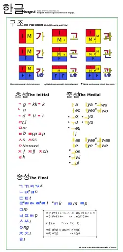 Ortografia modernă în hangul se folosește de 24 de litere simple: 14 litere-consoană[lower-alpha 3] și 10 litere-vocală.[lower-alpha 4] Există și 27 de litere complexe, formate prin combinarea literelor de bază: 5 litere-consoană tari/încordate,[lower-alpha 5] 11 litere-consoană complexe[lower-alpha 6] și 11 litere-vocală complexe.[lower-alpha 7] Patru litere din alfabetul original nu mai sunt folosite: o literă-vocală[lower-alpha 8] și trei litere-consoană.[lower-alpha 9] Literele coreene se scriu în blocuri silabice, literele fiind aranjate bidimensional. De exemplu, cuvântul pentru „albină” se scrie 꿀벌 (kkul beol), nu ㄲㅜㄹㅂㅓㄹ (kk u l b eo l).[11] Silabele încep cu o consoană, urmată de o vocală, și apoi (opțional) de o altă consoană numită batchim (받침). Dacă silaba începe cu un sunet vocalic, consoana ㅇ (ng) este folosită pe post de înlocuitor mut.