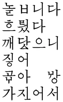 | Hunminjeongeum | 훈민정음 (grafie modernă) 훈〮민져ᇰ〮ᅙᅳᆷ (grafie originală) | ||||||||