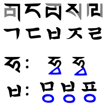 Silabele pot începe cu consoane simple sau tari, dar nu complexe. Vocala poate fi simplă sau complexă, iar cea de-a doua consoană poate fi simplă, complexă sau poate face parte dintr-un set restrâns de consoane tari. Structura grafică a silabei depinde de forma liniei de bază a vocalei: orizontală, verticală sau mixtă. Dacă linia de bază e verticală, atunci prima consoană și vocala se scriu de la stânga la dreapta, deasupra celei de-a doua consoane (dacă este prezentă); dacă linia de bază e orizontală, toate componentele sunt scrise de sus în jos; dacă există o linie de bază orizontală și una verticală, vocala complexă împrejmuiește prima consoană în jos și la dreapta, fiind apoi urmată de a doua consoană dedesubt (dacă este prezentă). Componentele unei consoane duble/complexe se scriu de la stânga la dreapta.[11]