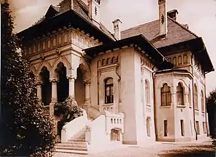 Datele exacte despre construcția conacului sunt puțin cunoscute, aceasta fiind consemnată pentru prima oară într-un plan topografic din 1946. Stilul arhitectural este greu de definit, înglobând în mod armonios elemente din stilurile: neogotic, neoromânesc, rustic normand, stil chalet și Art Nouveau, la care se adaugă în special la interior, motive clasice și neobizantine. Deși inițial construită ca o locuință, are centrat în interiorul ei un amplu hol de onoare, pe două niveluri, cu rol de sală de bal sau banchet. În forma sa originală, casa avea un spațiu destinat orchestrei. La parter, în jurul acestei săli centrale, sunt construite patru spații care funcționau ca saloane de primire (sufragerii). Etajul întâi păstrează în linii mari aceeași dispunere a spațiilor de la parter, accesul făcându-se pe o scară în spirală. Etajul al doilea a fost destinat probabil, dormitoarelor, iar mansarda unor spații de servicii. În Lista Monumentelor Istorice, casa figurează ca aparținând Elenei Lupescu, marea iubire a Regelui Carol al II-lea, dar în mod suspect orice legătură cu această doamnă a fost ștearsă din istorie.