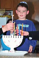 Ceremonia se desfășoară în special în familie, dar se aprind lumânări și la sinagogă, iar copii primesc o mică sumă de bani (ghelt în idiș).