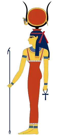 | Cea mai comună reprezentare a lui Hathor, bazată parțial pe reprezentări din mormântul lui Nefertari | |