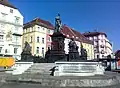 | 6 | Bürgerhaus Zum großen Christoph | Casa de la colțul Hauptplatz cu Franziskanergasse datează din secolul al XVII-lea. Pe fațada frontală sunt două foișoare dreptunghiulare sprijinite pe console. Fresca de pe fațadă cu reprezentarea Sf. Cristofor a fost executată de P. Scholz și este înconjurată de un cadru din stuc cu frunze. Basorelieful din gresie cu imaginea miraculoasă a Mariei (1975) este conceput în stilul lui Lucas Cranach cel Bătrân și are ornamente în formă de panglici.[6] | ![]() |