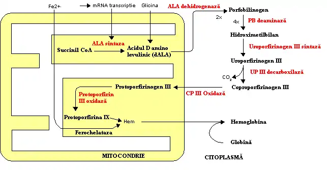 Tabel ce prezintă intermediarii și cu enzimele implicate în sinteza hemului Arhivat în , la Wayback Machine. Arhivat în , la Wayback Machine.