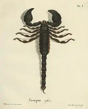 | Heterometrus indus ilustrație istorică (ca Scorpio afer) de J.F.W. Herbst în ”Natursystem der ungeflügelten Insekten” (1800).[1] | |