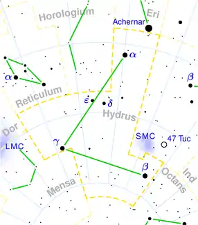 | Cea mai strălucitoare | β Hyi (2,82m) |