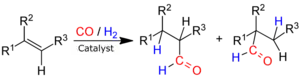 Procesul presupune tratarea unei alchene, de obicei la presiune ridicată (între 10 și 100 de atmosfere) cu monoxid de carbon și hidrogen la o temperatură ce variază între 40 și 200 °C.[2] Este necesar un catalizator metal tranzițional.
