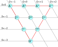 | Rezonanță sigma [6] | Σ*-(1385) | dds | 1 387,2(5) | 1 | 3⁄2+ | −1 | −1 | 0 | 0 | Λ + π sau Σ + π | |