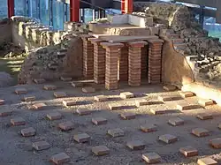 În afara construcției se afla un focar mare, denumit praefurnium, din care, aerul cald era trimis printr-o canalizare aflată sub pardoseală, care era construită pe stâlpișori de cărămidă (pilettes). În general, spațiul gol de sub podea, care permitea circulația aerului cald, era de 30-60 cm. Se estimează că temperatura obținută în camere nu putea depăși 30°C.